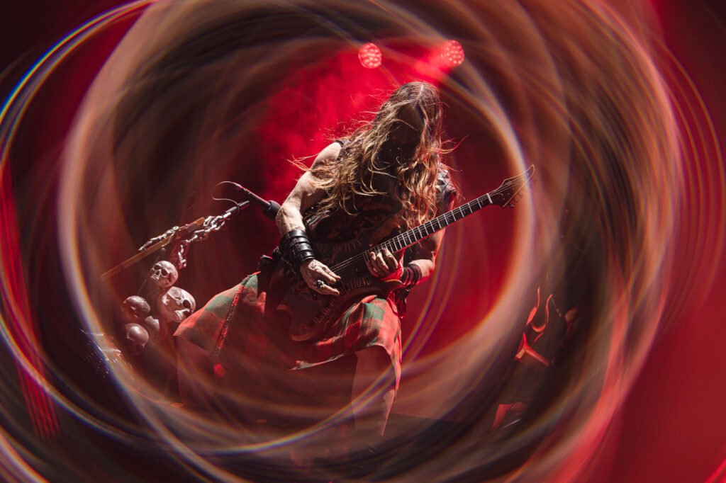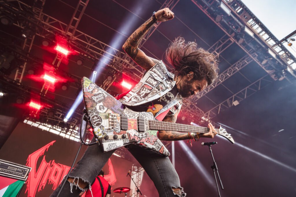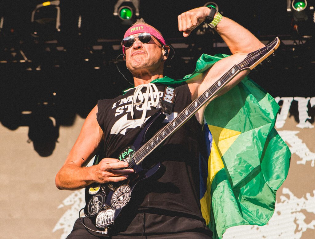 Por volta das 14h, o fluxo de pessoas no Memorial da América Latina já indicava um aumento considerável de público. Esse preenchimento do espaço tornou o deslocamento entre os palcos principais e o Sun Stage um exercício de paciência maior para os presentes. O trajeto, realizado obrigatoriamente através de uma ponte que conecta as áreas do Bangers Open Air, ficou mais congestionado, embora o percurso ainda pudesse ser completado em um intervalo inferior a dez minutos, permitindo o trânsito entre as atrações sem grandes prejuízos ao cronograma dos fãs. O palco secundário recebeu um contingente grande de espectadores para a apresentação dos brasilienses do Violator, que protagonizaram um dos momentos de maior destaque de todo o primeiro dia do festival. “O underground chegou no Bangers”, anunciou o vocalista e baixista Pedro Arcanjo, dando início a uma sequência de composições de thrash metal “direto e reto”, estilo que o grupo refina há duas décadas. A sonoridade técnica e veloz da banda serviu como uma demonstração da vitalidade do metal nacional dentro de um line-up repleto de nomes estrangeiros. Além da parte musical, o Violator não se furtou de reforçar seu histórico posicionamento político. A apresentação foi permeada por mensagens explícitas, que incluíram desde a exposição de uma bandeira da Palestina no palco até uma dedicatória direta, antes da canção False Messiah (Falso Messias), ao ex-presidente brasileiro investigado e preso por tentativa de golpe de Estado. Tais intervenções trouxeram uma camada de protesto social ao evento, característica intrínseca à trajetória do grupo. O público respondeu à altura, não apenas ocupando todo o espaço disponível, mas também organizando intensas rodas de mosh, o que evidenciou a força do cenário underground. Para a parcela minoritária que demonstrou incômodo com os discursos, o recado de Arcanjo foi enfático: “Foda-se, não estamos nem aí”. Nas palavras do próprio vocalista, foi um “show de bueiro” transportado para o palco do maior festival do gênero na América Latina. Foi lindo!