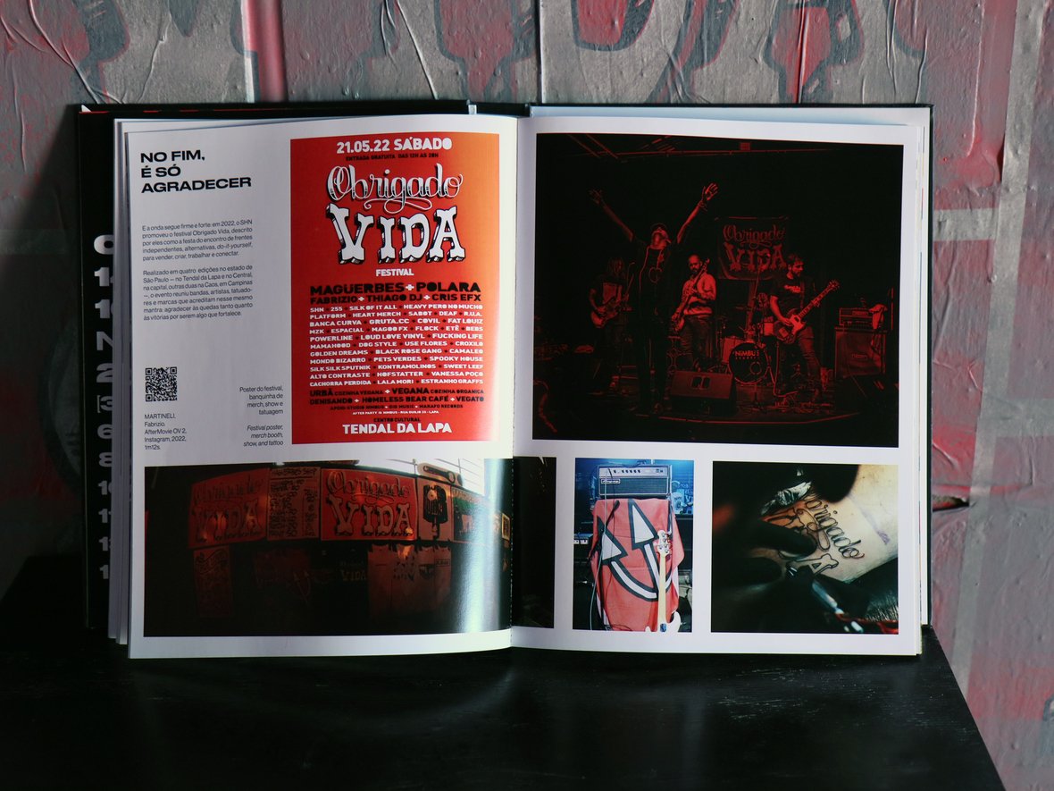 A publicação bilíngue (português e inglês) combina textos, fotos e ensaios de convidados que ajudam a reconstruir a trajetória do grupo — de suas origens no interior paulista às intervenções realizadas em espaços públicos de diferentes partes do mundo. Ícones visuais como a boca aberta colorida e os adesivos “Obrigado Vida”, que se espalharam por muros e ruas de todo o país, são revisitados em páginas que revelam bastidores e contextos de criação.