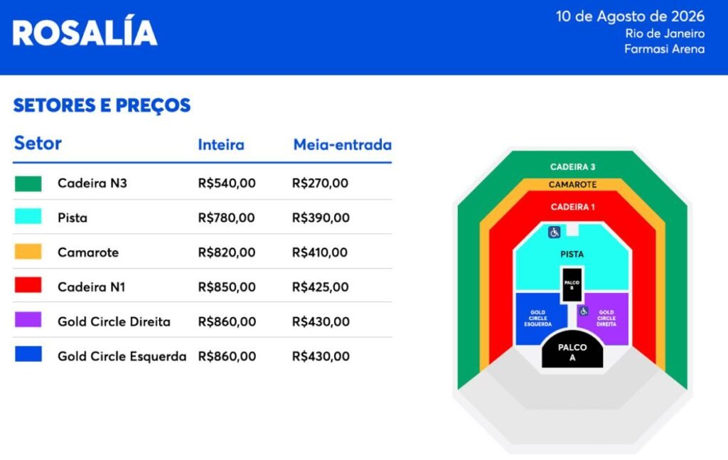 Ingressos de Rosalía no Brasil: No Brasil, os ingressos para o público em geral estarão à venda a partir de 10 de dezembro, às 10h online e às 11h na bilheteria oficial (sem taxa de serviço).